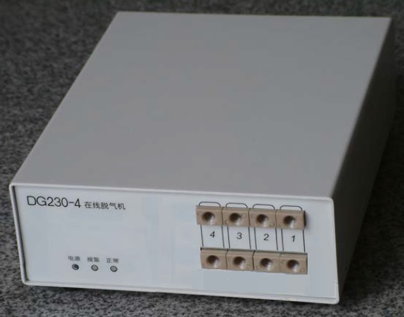 在高效液相色譜分析過程中,尤其進行多元梯度洗脫時,溶解在流動相中的氣體在混合時以氣泡形式逸出,它不僅影響色譜柱的分離效率,而且影響檢測器基線的穩定性降低靈敏度。QuikSep DG-230脫氣機的原理是流動相經由在線脫氣機的入口進入脫氣機中,在獨立的單元真空泵腔內,通過預先設定的真空度,真空泵連續低速運行,HPLC流動相在泵的作用下流經真空腔內一段很短的Teflon? AF脫氣膜管,按照Henry’s定律,在真空作用下,溶劑中溶解的氣體通過管壁排出。