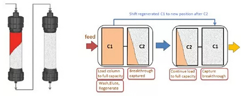 ? ? 傳統(tǒng)層析工藝,由于流穿效應(yīng),有30-50%的填料是無法被完全利用的,從而使得載量和處理量大為受限。Capture SMB用于優(yōu)化捕獲環(huán)節(jié),作為最簡單和最優(yōu)化的2柱位設(shè)計(jì),可使純化效率顯著提高,并且使填料用量大為縮減。
