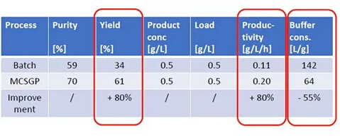 ? ? 有案例證明,MCSGP可將產(chǎn)品純度從傳統(tǒng)工藝的59%提升至70%,將收率從傳統(tǒng)工藝的34%提升至61%,從而使產(chǎn)量(g /L /h)整體提升80%,并同時(shí)使Buffer的消耗量降低55%。MCSGP工藝,無疑可顯著地節(jié)約成本投入,并可產(chǎn)生更多的生產(chǎn)效益。