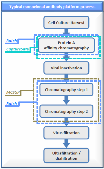 層析系統,已由2004年的6-8柱位設計、2006年的3柱位設計,發展為最優化的2柱位設計,可運行多種層析模式,如標準批處理過程、Capture SMBMCSGP(多柱逆流溶劑梯度純化)、N-Rich等,實現了層析新技術與層析系統軟硬件設計的完美結合,使得設備成本更低,構造更為簡化,并可使層析填料、緩沖液等成本投入大為節省,同時也使得純化周期大為縮短。