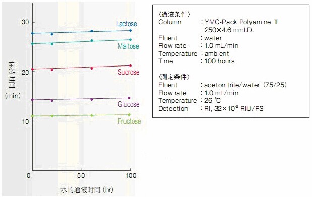 下圖顯示,即使在僅采用水作為流動相的困難條件下測試其耐用性,糖的保留時間變化也非常小。