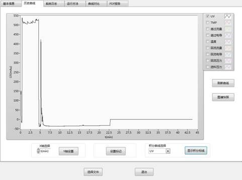 6) the flow, temperature, conductivity, pH, UV and other online detectors can be flexibly configured in the system according to the process requirements to record the operation curve in real time;