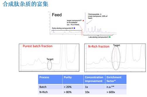 ? ? ??N-Rich工藝是微量物質(zhì)的富集過程,比如將產(chǎn)品的相關(guān)雜質(zhì)選擇性地富集在一個(gè)循環(huán)的層析過程中,待富集至目標(biāo)量,再進(jìn)行洗脫回收。該方法特別適用于分離與產(chǎn)品有關(guān)的雜質(zhì),如異構(gòu)體和聚集體,并同時(shí)用于發(fā)現(xiàn)研究。