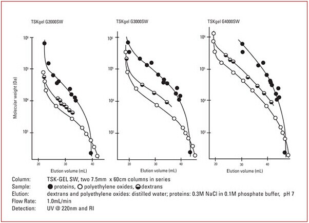TSKgel SW柱的聚氧化乙烯、葡聚糖和蛋白質校準曲線