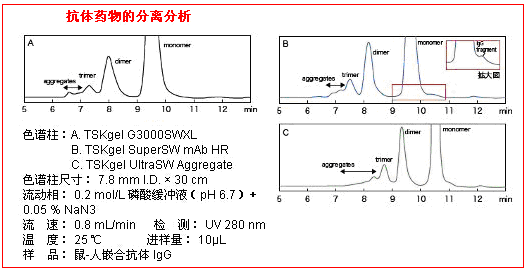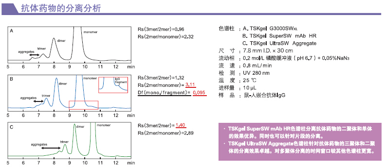1. 使用粒徑3 μm的硅膠基質為填充材料,比G3000SWXL等色譜柱具有更高的分子量排阻限,非常適用于分析抗體藥物中三聚體以上的多聚體等分子量較大的蛋白質。