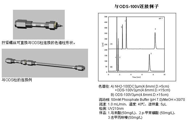 TSKgel NH2-100 DC 3μm 以鍵合了氨烷基的硅膠填料裝填了與后段的分析柱可以直接連接的色譜柱。不使用連接管也可連接2根色譜柱,可減少導(dǎo)致分離性能降低的死體積,2根分離模式不同的色譜柱的一體化,使用起來(lái)更方便。鍵合的氨基作為陰離子交換基發(fā)揮作用,協(xié)助完成后段色譜柱的分離,從而實(shí)現(xiàn)更好的分離成為可能。特別是與反相色譜柱的連接,醫(yī)藥品中的藥效成分和共存陰離子的同時(shí)分析成為可能。