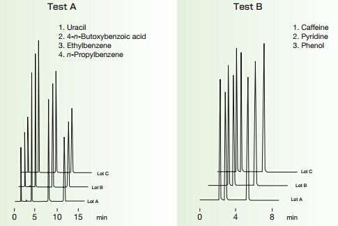 上圖為三批填料測試結(jié)果的比較,其顯示了對疏水性、親水性、堿性及酸性化合物都具有優(yōu)良的分離再現(xiàn)性。
